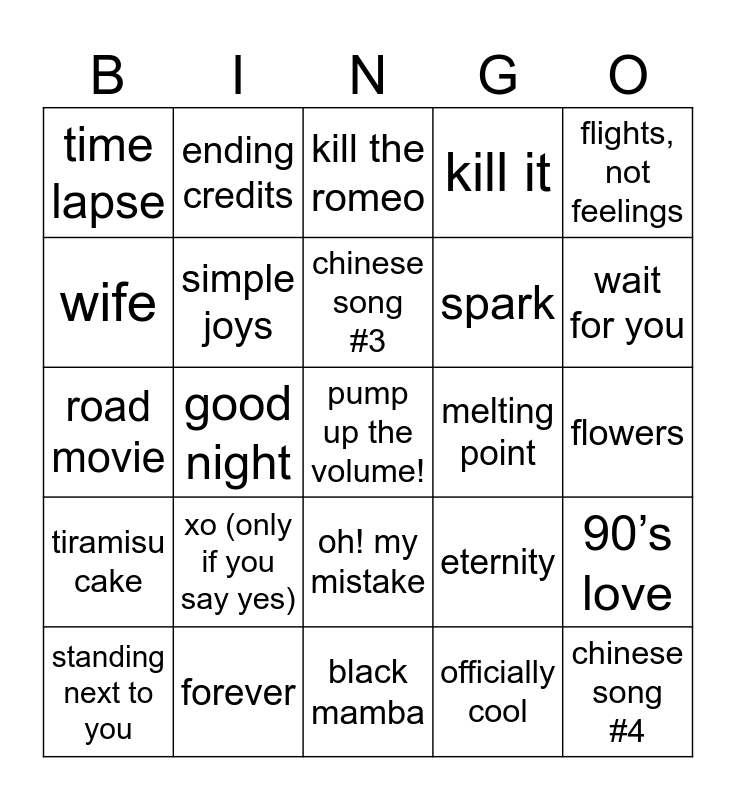 This bingo card has 50 words: fire in the belly, pump up the volume!, 9-teen, black mamba, xo (only if you say yes), yura yura, ending credits, aenergy, wife, in bloom, simple joys, kill it, 90’s love, eternity, ditto, spicy, chinese song #3, melting point, can i call you tonight?, flights, not feelings, good night, officially cool, time lapse, spark, somebody, chinese song #4, wait for you, salty & sweet, kill the romeo, oh! my mistake, i wanna know, pink hoodie, insomnia, but i like you, forever, savage, ddara, the sea, earth, wind & fire, flowers, siren (taeyeon’s!), plot twist, chasing that feeling, trick or trick, standing next to you, road movie, 9 days, next level, tiramisu cake and tamed-dashed.