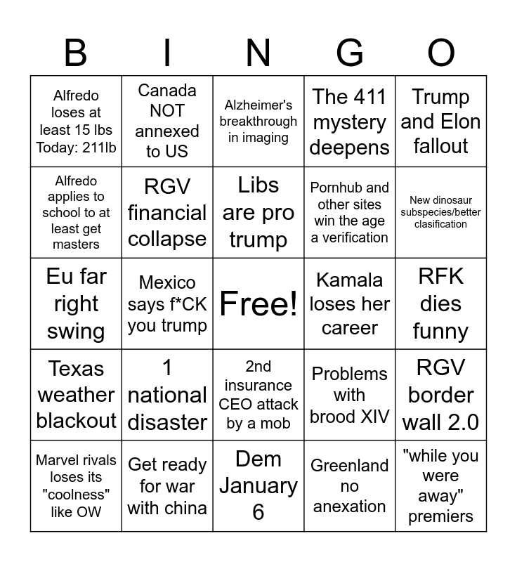 This bingo card has a free space and 24 words: 1 national disaster, Get ready for war with china, Libs are pro trump, Marvel rivals loses its "coolness" like OW, Trump and Elon fallout, Alfredo loses at least 15 lbs Today: 211lb, Alfredo applies to school to at least get masters, Canada NOT annexed to US, Kamala loses her career, 2nd insurance CEO attack by a mob, Pornhub and other sites win the age a verification, Eu far right swing, Problems with brood XIV, RGV border wall 2.0, RGV financial collapse, Greenland no anexation, RFK dies funny, Alzheimer's breakthrough in imaging, New dinosaur subspecies/better clasification, Mexico says f*CK you trump, "while you were away" premiers, Texas weather blackout, The 411 mystery deepens and Dem January 6.