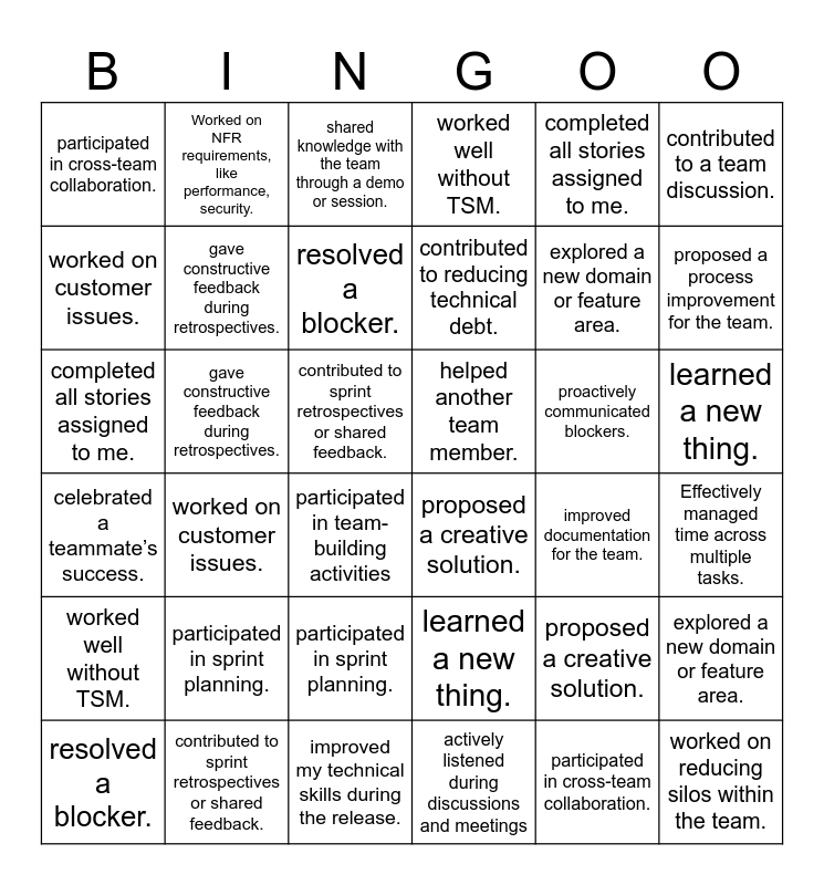 This bingo card has 70 words: improved my technical skills during the release., contributed to sprint retrospectives or shared feedback., pair-programmed with a teammate., actively listened during discussions and meetings, proposed a creative solution., contributed to a team discussion., worked well without TSM., proactively communicated blockers., completed all stories assigned to me., worked on a critical issue., worked on customer issues., participated in team-building activities, participated in cross-team collaboration., shared knowledge with the team through a demo or session., reviewed code and provided constructive feedback., proposed a process improvement for the team., learned a new thing., resolved a blocker., improved documentation for the team., helped another team member., gave constructive feedback during retrospectives., celebrated a teammate’s success., contributed to reducing technical debt., participated in sprint planning., explored a new domain or feature area., worked extra to ensure we met a sprint goal., Utilized tools or automation to improve workflow., Focused on improving code readability or maintainability., Effectively managed time across multiple tasks., Helped identify root causes for recurring issues., Worked on NFR requirements, like performance, security., Taken more leaves, I spilled my story/ies., worked on reducing silos within the team., improved my technical skills during the release., contributed to sprint retrospectives or shared feedback., pair-programmed with a teammate., actively listened during discussions and meetings, proposed a creative solution., contributed to a team discussion., worked well without TSM., proactively communicated blockers., completed all stories assigned to me., worked on a critical issue., Free Sapce, worked on customer issues., participated in team-building activities, participated in cross-team collaboration., shared knowledge with the team through a demo or session., worked on reducing silos within the team., reviewed code and provided constructive feedback., proposed a process improvement for the team., learned a new thing., resolved a blocker., improved documentation for the team., helped another team member., gave constructive feedback during retrospectives., celebrated a teammate’s success., contributed to reducing technical debt., participated in sprint planning., explored a new domain or feature area., worked extra to ensure we met a sprint goal., Utilized tools or automation to improve workflow., Focused on improving code readability or maintainability., Effectively managed time across multiple tasks., Free Space, Helped identify root causes for recurring issues., Worked on NFR requirements, like performance, security., Taken more leaves and I spilled my story/ies..