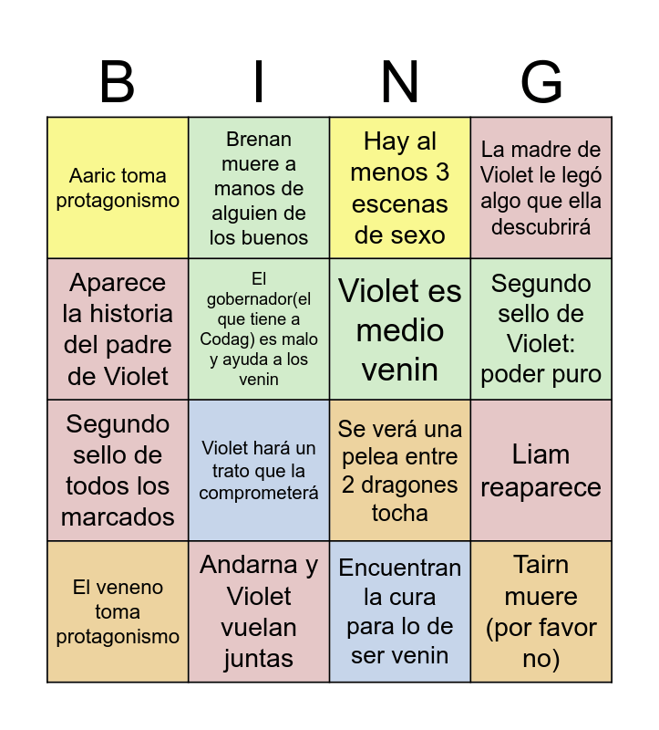 This bingo card has 16 words: Andarna y Violet vuelan juntas, Liam reaparece, Hay al menos 3 escenas de sexo, Aaric toma protagonismo, Segundo sello de todos los marcados, Brenan muere a manos de alguien de los buenos, Se verá una pelea entre 2 dragones tocha, Encuentran la cura para lo de ser venin, Aparece la historia del padre de Violet, El gobernador(el que tiene a Codag) es malo y ayuda a los venin, El veneno toma protagonismo, La madre de Violet le legó algo que ella descubrirá, Violet hará un trato que la comprometerá, Segundo sello de Violet: poder puro, Violet es medio venin and Tairn muere (por favor no).