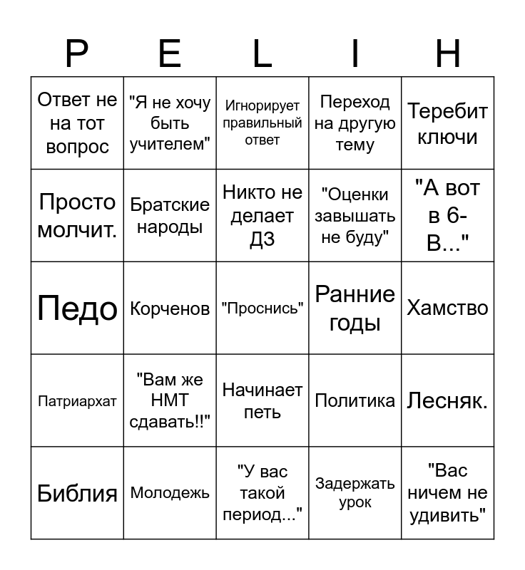 This bingo card has 25 words: "Вам же НМТ сдавать!!", "У вас такой период...", Никто не делает ДЗ, Библия, Теребит ключи, Ответ не на тот вопрос, Просто молчит., "Я не хочу быть учителем", Ранние годы, Начинает петь, "Оценки завышать не буду", Педо, Политика, Лесняк., Братские народы, "Вас ничем не удивить", Хамство, Игнорирует правильный ответ, "А вот в 6-В...", Корченов, "Проснись", Молодежь, Патриархат, Переход на другую тему and Задержать урок.