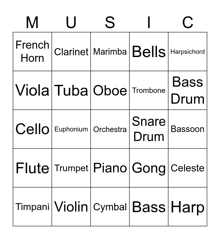 This bingo card has a free space and 24 words: Trumpet, Violin, Oboe, Timpani, Harpsichord, French Horn, Viola, Clarinet, Snare Drum, Piano, Trombone, Cello, Gong, Celeste, Tuba, Bass, Bassoon, Marimba, Bass Drum, Euphonium, Harp, Flute, Bells and Cymbal.