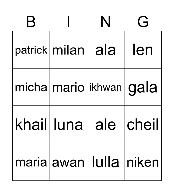 This bingo card has 16 words: awan, cheil, ala, patrick, khail, milan, ale, lulla, micha, mario, maria, len, luna, gala, ikhwan and niken.