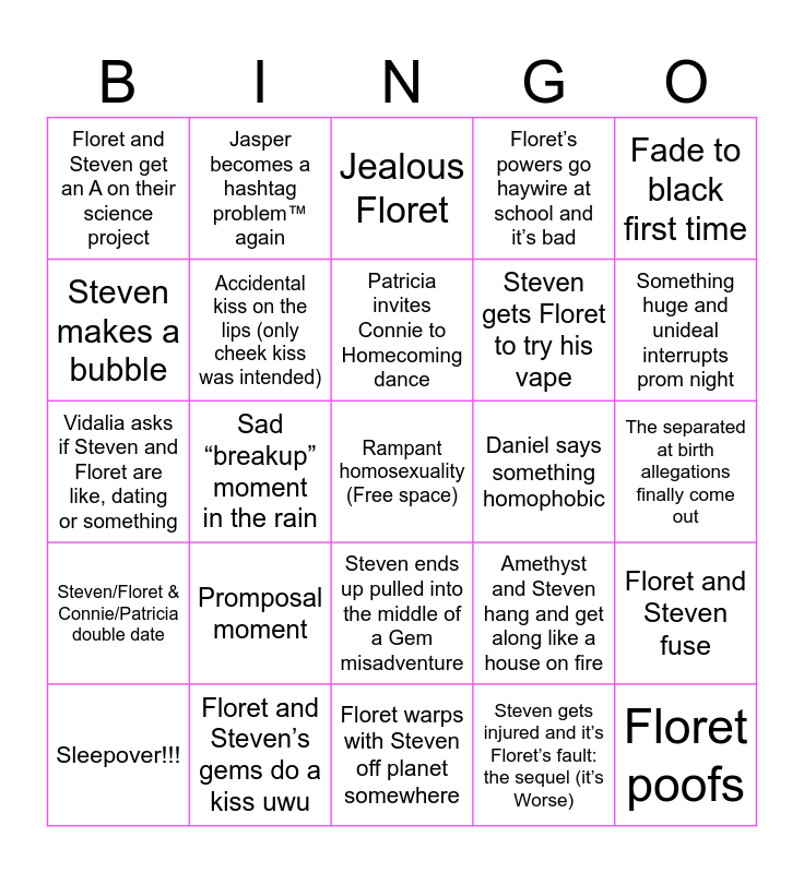 This bingo card has a free space and 24 words: Promposal moment, Floret and Steven’s gems do a kiss uwu, Patricia invites Connie to Homecoming dance, Sleepover!!!, Fade to black first time, Floret and Steven get an A on their science project, Steven makes a bubble, Jasper becomes a hashtag problem™️ again, Daniel says something homophobic, Steven ends up pulled into the middle of a Gem misadventure, Steven gets Floret to try his vape, Vidalia asks if Steven and Floret are like, dating or something, Amethyst and Steven hang and get along like a house on fire, Floret and Steven fuse, Accidental kiss on the lips (only cheek kiss was intended), Steven gets injured and it’s Floret’s fault: the sequel (it’s Worse), The separated at birth allegations finally come out, Jealous Floret, Something huge and unideal interrupts prom night, Sad “breakup” moment in the rain, Floret poofs, Steven/Floret & Connie/Patricia double date, Floret’s powers go haywire at school and it’s bad and Floret warps with Steven off planet somewhere.