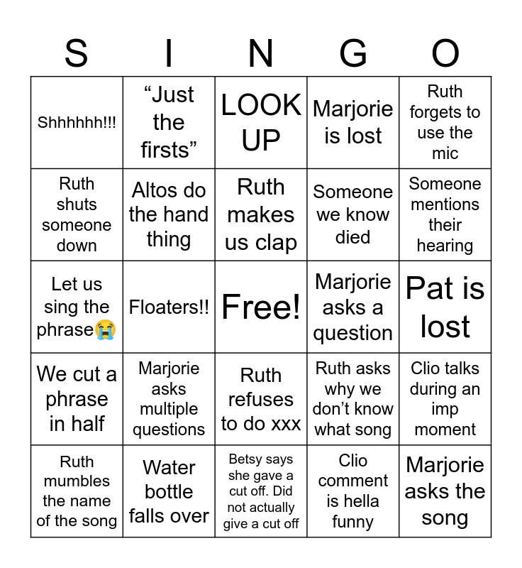 This bingo card has a free space and 40 words: Ruth is asked to use the mic, Let us sing the phraseđ, Ruth moves on without us, Altos do the hand thing, Water bottle falls over, Ruth refuses to do xxx, Ruth makes us clap, Someone makes a gay joke, Ruth forgets to use the mic, We cut a phrase in half, Floaters!!, Marjorie is lost, Marjorie asks the song, Pat is lost, Marjorie asks a question, Marjorie asks multiple questions, Ruth is overwhelmed, Shhhhhh!!!, Someone makes a music joke, LOOK UP, Clio talks during an imp moment, Clio comment is hella funny, Someone we know died, Ruth shuts someone down, âIf youâd look upâ, âUp in the stratosphereâ, âPlease sign up for snacks!â, âThe AC Meeting is this weekâ, Big sigh, âListen to your music!â, Soprano/ Alto joke, Ruth mumbles the name of the song, Ruth yells at us, Ruth asks why we donât know what song, Someone mentions their hearing, Betsy says she gave a cut off. Did not actually give a cut off, âSTOP STOP STOPâ, Sarcastic comment about rests, âJust the firstsâ and âJust the secondsâ.