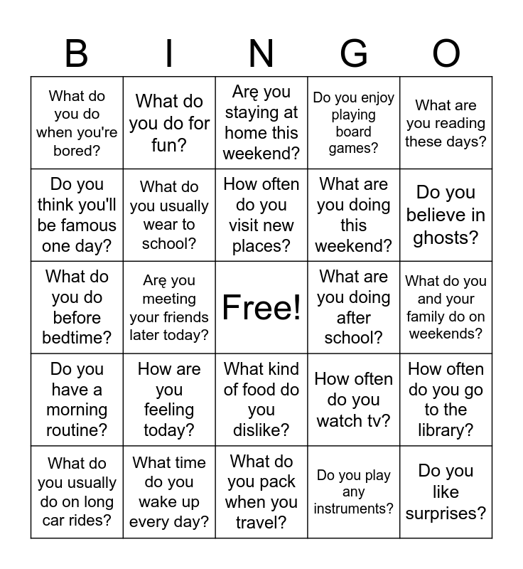 This bingo card has a free space and 24 words: How are you feeling today?, What time do you wake up every day?, How often do you visit new places?, What do you usually do on long car rides?, What are you reading these days?, What do you do when you're bored?, Do you think you'll be famous one day?, What do you do for fun?, What are you doing after school?, What kind of food do you dislike?, What are you doing this weekend?, What do you do before bedtime?, How often do you watch tv?, How often do you go to the library?, What do you usually wear to school?, Do you play any instruments?, What do you and your family do on weekends?, Arę you staying at home this weekend?, Do you believe in ghosts?, Arę you meeting your friends later today?, Do you like surprises?, Do you have a morning routine?, Do you enjoy playing board games? and What do you pack when you travel?.