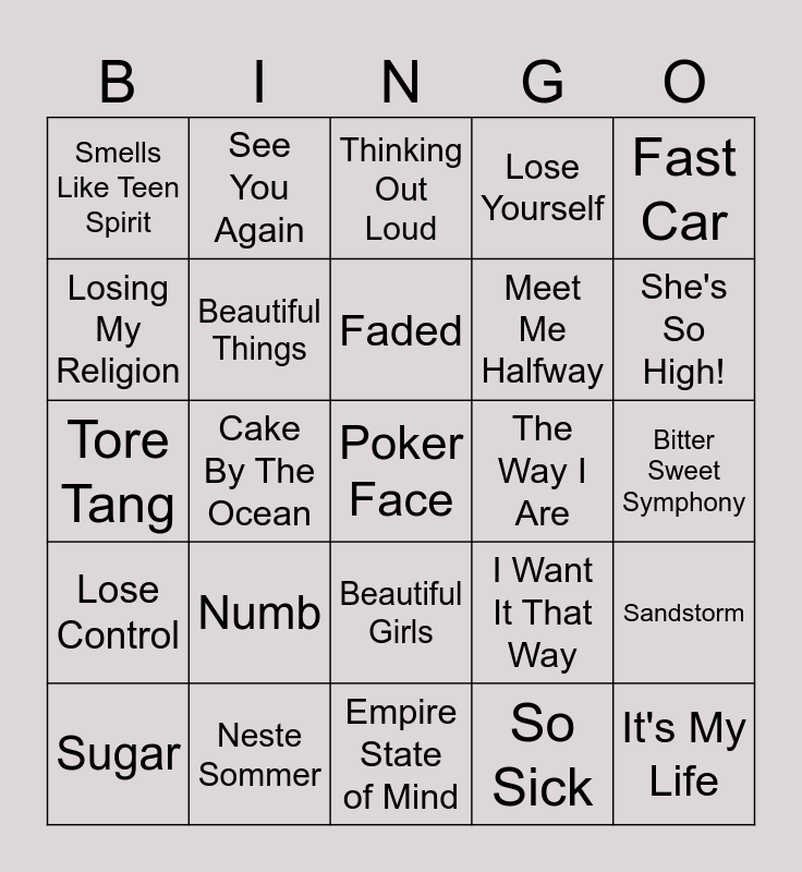 This bingo card has a free space and 34 words: Seven Nation Army, So Sick, Classic, Love The Way You Lie, Lose Control, Beautiful Things, Fast Car, Sugar, See You Again, Can't Hold Us, Faded, Thinking Out Loud, Thrift Shop, Uptown Funk, The Way I Are, She's So High!, Neste Sommer, Tore Tang, Numb, I Want It That Way, Beautiful Girls, Killing Me Softly, Smells Like Teen Spirit, Bitter Sweet Symphony, Empire State of Mind, It's My Life, Lose Yourself, Bye Bye Bye, Meet Me Halfway, Losing My Religion, Don't Stop Believin', Cake By The Ocean, Sandstorm and Dragostea Din Tei.