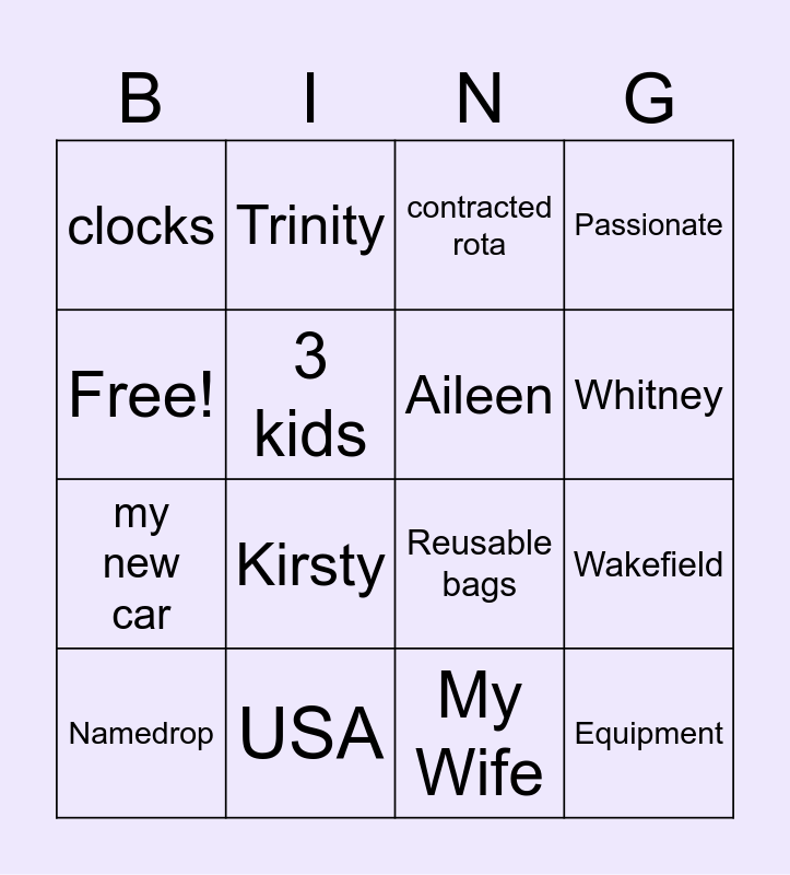 This bingo card has 16 words: USA, Wakefield, contracted rota, clocks, my new car, Trinity, Reusable bags, My Wife, Free!, 3 kids, Namedrop, Passionate, Kirsty, Whitney, Aileen and Equipment.