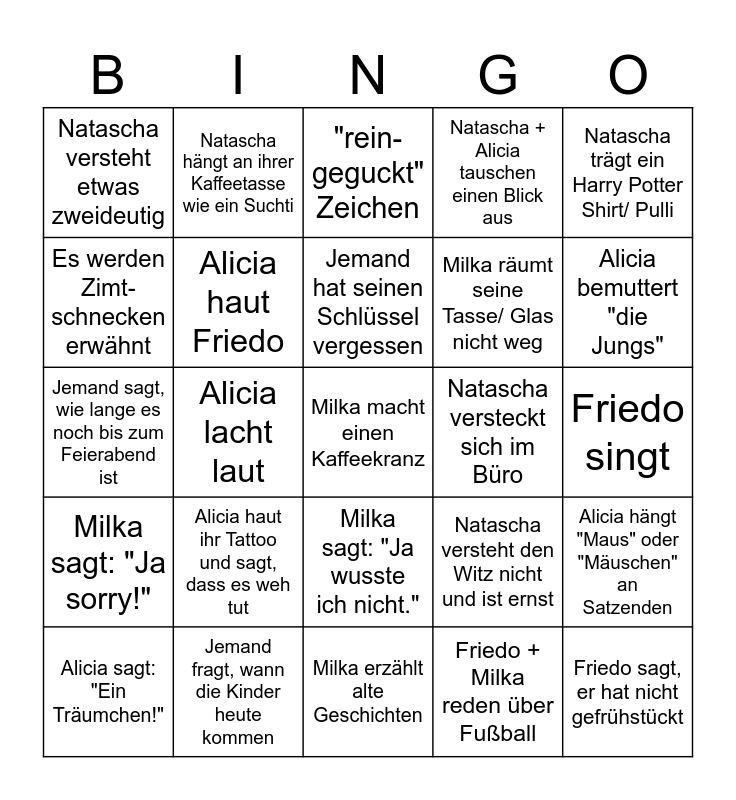 This bingo card has 31 words: Milka erzählt alte Geschichten, Friedos Wasserhahn wird erwähnt, Alicia lacht laut, "Friedo ist 14", Natascha versteht etwas zweideutig, "rein-geguckt" Zeichen, Alicia haut Friedo, Natascha versteht den Witz nicht und ist ernst, Natascha versteckt sich im Büro, Friedo + Milka reden über Fußball, Friedo singt, Milka macht einen Kaffeekranz, Friedo sagt, er hat nicht gefrühstückt, Friedo sagt, er mag etwas (Essen) nicht, Alicia bemuttert "die Jungs", Friedo + Milka verlassen sich auf Alicia, Alicia hängt "Maus" oder "Mäuschen" an Satzenden, Alicia haut ihr Tattoo und sagt, dass es weh tut, Milka sagt: "Ja sorry!", Milka sagt: "Ja wusste ich nicht.", Natascha trägt ein Harry Potter Shirt/ Pulli, Natascha spricht zu laut während sie neben jemanden steht, Alicia sagt: "Ein Träumchen!", Natascha hängt an ihrer Kaffeetasse wie ein Suchti, Milka räumt seine Tasse/ Glas nicht weg, Es werden Zimt-schnecken erwähnt, Natascha + Alicia tauschen einen Blick aus, Jemand sagt, wie lange es noch bis zum Feierabend ist, Jemand fragt, wann die Kinder heute kommen, Jemand hat seinen Schlüssel vergessen and Jemand sagt: Friiieedooo.