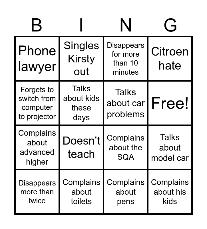 This bingo card has 17 words: Complains about pens, Disappears more than twice, Disappears for more than 10 minutes, Phone lawyer, Doesn’t teach, Citroen hate, Talks about model car, Talks about car problems, Free!, Talks about kids these days, Complains about toilets, Complains about the SQA, Forgets to switch from computer to projector, Singles Kirsty out, Complains about advanced higher, Complains about teaching time and Complains about his kids.