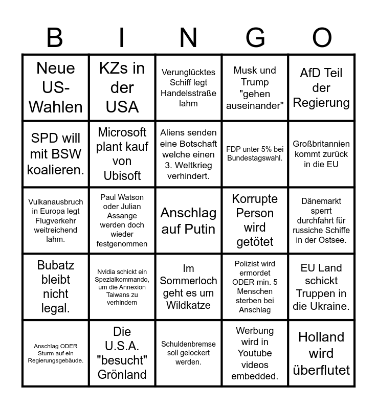 This bingo card has 25 words: Nvidia schickt ein Spezialkommando, um die Annexion Taiwans zu verhindern, Schuldenbremse soll gelockert werden., Aliens senden eine Botschaft welche einen 3. Weltkrieg verhindert., Anschlag ODER Sturm auf ein Regierungsgebäude., AfD Teil der Regierung, Neue US-Wahlen, SPD will mit BSW koalieren., KZs in der USA, Korrupte Person wird getötet, Im Sommerloch geht es um Wildkatze, FDP unter 5% bei Bundestagswahl., Vulkanausbruch in Europa legt Flugverkehr weitreichend lahm., Polizist wird ermordet ODER min. 5 Menschen sterben bei Anschlag, EU Land schickt Truppen in die Ukraine., Microsoft plant kauf von Ubisoft, Holland wird überflutet, Dänemarkt sperrt durchfahrt für russiche Schiffe in der Ostsee., Verunglücktes Schiff legt Handelsstraße lahm, Großbritannien kommt zurück in die EU, Paul Watson oder Julian Assange werden doch wieder festgenommen, Anschlag auf Putin, Die U.S.A. "besucht" Grönland, Bubatz bleibt nicht legal., Musk und Trump "gehen auseinander" and Werbung wird in Youtube videos embedded..