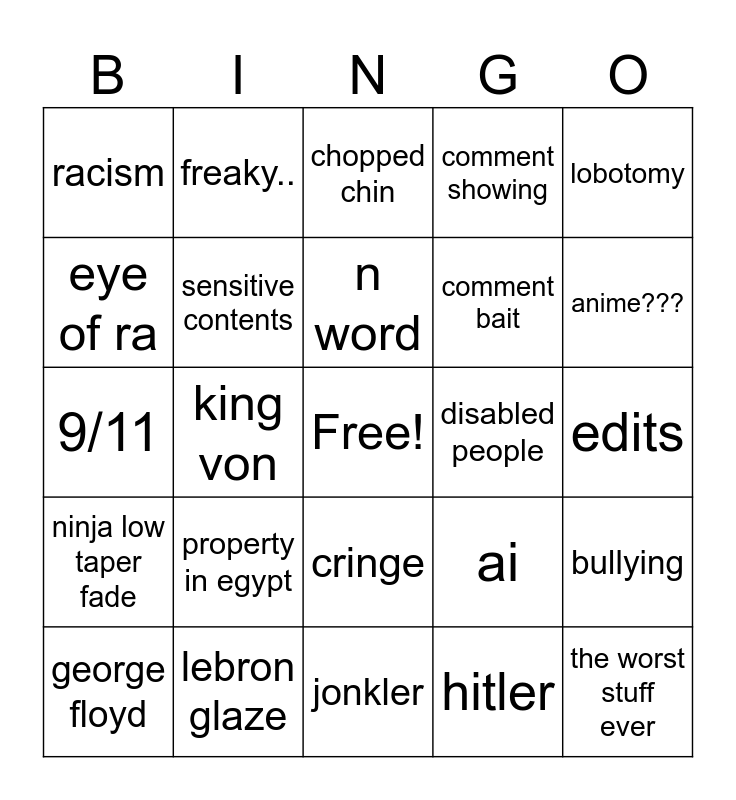 This bingo card has a free space and 24 words: property in egypt, lebron glaze, n word, george floyd, lobotomy, racism, eye of ra, freaky.., disabled people, cringe, comment bait, 9/11, ai, bullying, sensitive contents, hitler, edits, chopped chin, anime???, king von, the worst stuff ever, ninja low taper fade, comment showing and jonkler.