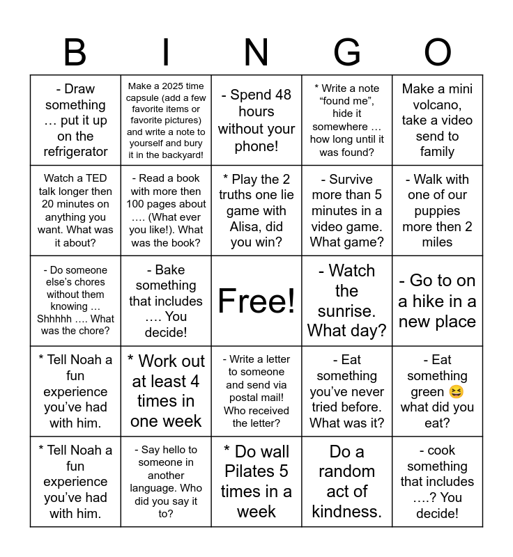 This bingo card has a free space and 25 words: * Work out at least 4 times in one week, * Do wall Pilates 5 times in a week, * Play the 2 truths one lie game with Alisa, did you win?, * Tell Noah a fun experience you’ve had with him., Make a mini volcano, take a video send to family, - Draw something … put it up on the refrigerator, Watch a TED talk longer then 20 minutes on anything you want. What was it about?, Make a 2025 time capsule (add a few favorite items or favorite pictures) and write a note to yourself and bury it in the backyard!, - Watch the sunrise. What day?, - Write a letter to someone and send via postal mail! Who received the letter?, - Survive more than 5 minutes in a video game. What game?, - Do someone else’s chores without them knowing … Shhhhh …. What was the chore?, - Eat something you’ve never tried before. What was it?, - Eat something green 😆 what did you eat?, - Read a book with more then 100 pages about …. (What ever you like!). What was the book?, Find a coin before 1960, - Go to on a hike in a new place, - Spend 48 hours without your phone!, - Walk with one of our puppies more then 2 miles, - Bake something that includes …. You decide!, - cook something that includes ….? You decide!, - Say hello to someone in another language. Who did you say it to?, * Tell Noah a fun experience you’ve had with him., * Write a note “found me”, hide it somewhere … how long until it was found? and Do a random act of kindness..