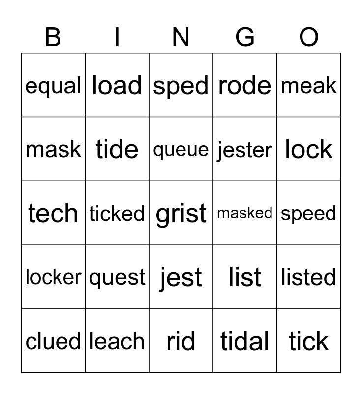 This bingo card has a free space and 24 words: quest, leach, queue, clued, meak, equal, mask, load, masked, jest, jester, tech, list, listed, tide, tidal, speed, sped, lock, ticked, tick, locker, rode and rid.