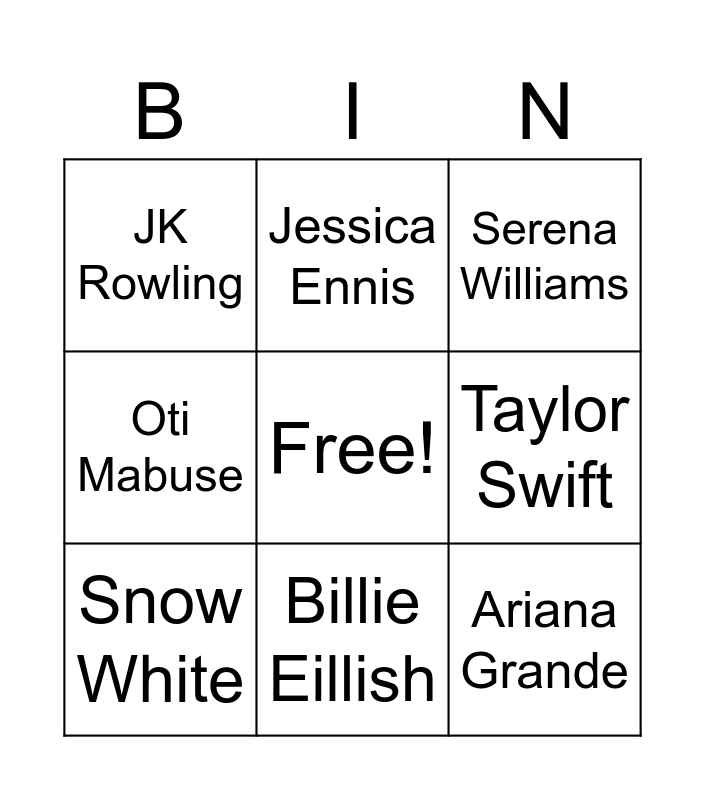This bingo card has a free space and 11 words: Mary Earps, Billie Eillish, Ariana Grande, Snow White, Jessica Ennis, Serena Williams, Taylor Swift, Jill Scott, Oti Mabuse, JK Rowling and Jennifer Anniston.