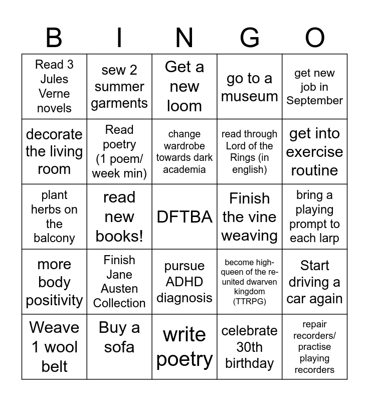 This bingo card has a free space and 24 words: Finish Jane Austen Collection, Buy a sofa, change wardrobe towards dark academia, Weave 1 wool belt, get new job in September, Read 3 Jules Verne novels, decorate the living room, sew 2 summer garments, Finish the vine weaving, pursue ADHD diagnosis, read through Lord of the Rings (in english), plant herbs on the balcony, become high-queen of the re-united dwarven kingdom (TTRPG), Start driving a car again, Read poetry (1 poem/ week min), celebrate 30th birthday, bring a playing prompt to each larp, Get a new loom, get into exercise routine, read new books!, repair recorders/ practise playing recorders, more body positivity, go to a museum and write poetry.