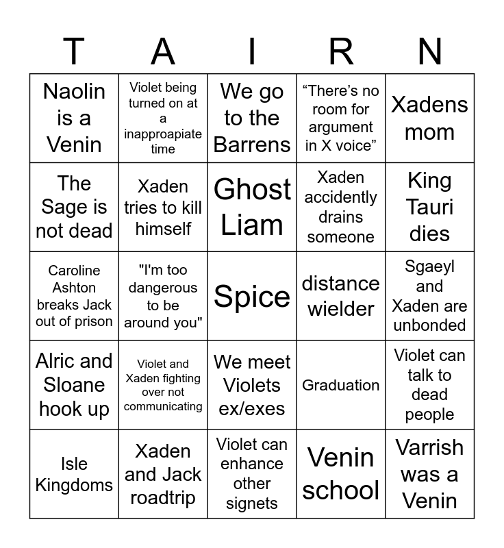 This bingo card has a free space and 24 words: Violet and Xaden fighting over not communicating, Xaden and Jack roadtrip, Ghost Liam, Isle Kingdoms, Xadens mom, Naolin is a Venin, The Sage is not dead, Violet being turned on at a inapproapiate time, distance wielder, We meet Violets ex/exes, Xaden accidently drains someone, Caroline Ashton breaks Jack out of prison, Graduation, Violet can talk to dead people, Xaden tries to kill himself, Venin school, Sgaeyl and Xaden are unbonded, We go to the Barrens, King Tauri dies, "I'm too dangerous to be around you", Varrish was a Venin, Alric and Sloane hook up, “There’s no room for argument in X voice” and Violet can enhance other signets.