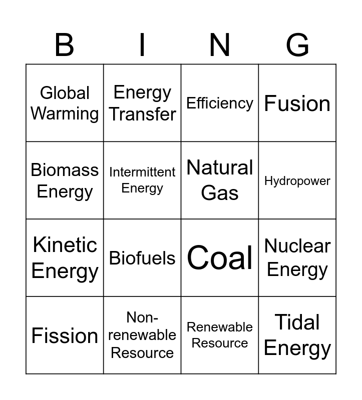 This bingo card has 41 words: Free!, Coal, Oil, Natural Gas, Solar Energy, Wind Energy, Hydropower, Geothermal Energy, Biomass Energy, Tidal Energy, Nuclear Energy, Fusion, Fission, Renewable Resource, Non-renewable Resource, Carbon Emissions, Greenhouse Effect, Global Warming, Fossil Fuels, Efficiency, Sustainability, Turbine, Generator, Kinetic Energy, Potential Energy, Grid, Battery Storage, Photovoltaic Cell, Biofuels, Wave Energy, Energy Conservation, Energy Transfer, Power Station, Carbon Footprint, Non-polluting Energy, Intermittent Energy, Base Load Power, Peaking Power, Energy Crisis, Extraction and Decommissioning.