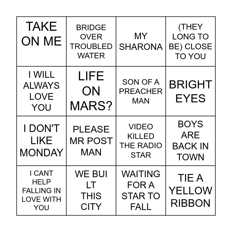 This bingo card has 30 words: DON'T STOP BELIEVING, LIVIN ON A PRAYER, BOYS ARE BACK IN TOWN, JESSIE'S GIRL, TAKE ON ME, MY SHARONA, SON OF A PREACHER MAN, CHIRPY CHEEP CHEEP, WE BUILT THIS CITY, SUMMER OF 69, WAITING FOR A STAR TO FALL, I CANT HELP FALLING IN LOVE WITH YOU, TOOK THE WORDS RIGHT OUT OF MY MOUTH, YOU'RE SO VAIN, PLEASE MR POST MAN, SUNDAY GIRL, EVERYBODY WANTS TO RULE THE WORLD, TIE A YELLOW RIBBON, STAND BY ME, I WILL ALWAYS LOVE YOU, VIDEO KILLED THE RADIO STAR, LOVE GROWS WHERE MY ROSMARY GOES, BRIDGE OVER TROUBLED WATER, I DON'T LIKE MONDAY, LIFE ON MARS?, (THEY LONG TO BE) CLOSE TO YOU, ROSE GARDEN, MR BLUE SKY, BRIGHT EYES and IMAGINE.