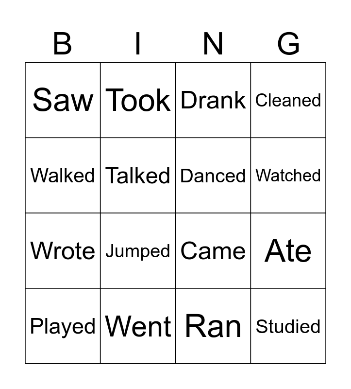 This bingo card has 16 words: Went, Ate, Drank, Saw, Wrote, Took, Came, Ran, Walked, Talked, Played, Cleaned, Jumped, Watched, Danced and Studied.