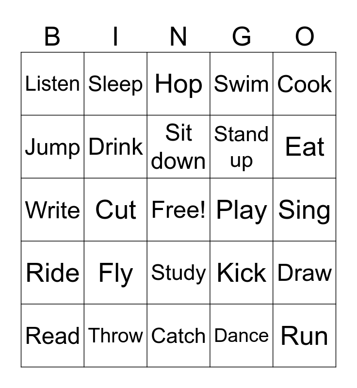 This bingo card has a free space and 24 words: Fly, Throw, Sit down, Read, Cook, Listen, Jump, Sleep, Play, Study, Stand up, Write, Kick, Draw, Drink, Dance, Sing, Hop, Eat, Cut, Run, Ride, Swim and Catch.