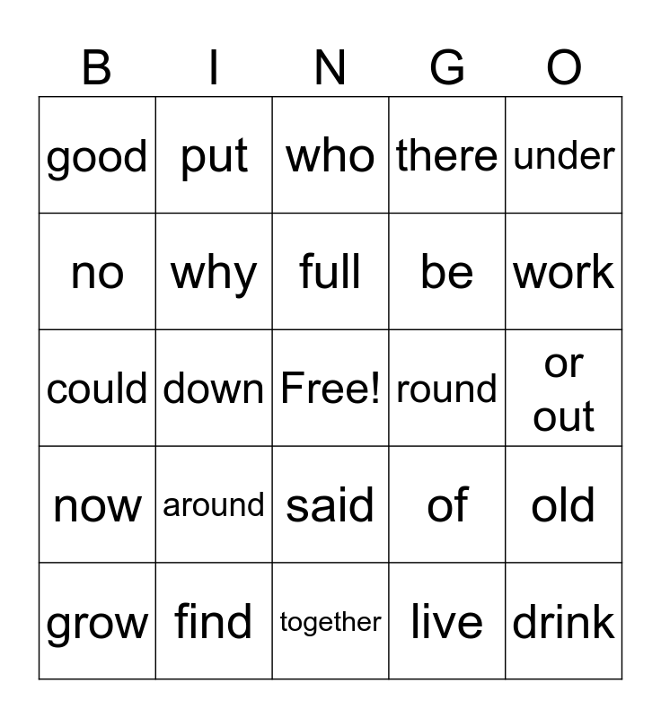 This bingo card has a free space and 24 words: around, find, full, grow, under, good, no, put, round, said, be, could, of, old, why, live, or out, who, work, down, drink, now, there and together.