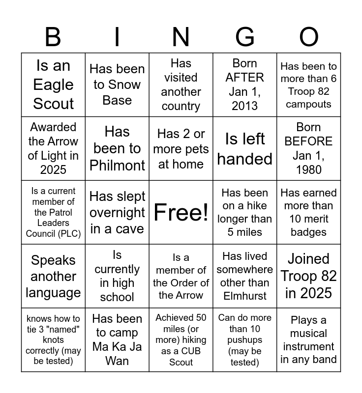 This bingo card has a free space and 24 words: Is currently in high school, Has been to camp Ma Ka Ja Wan, Has 2 or more pets at home, knows how to tie 3 "named" knots correctly (may be tested), Has been to more than 6 Troop 82 campouts, Is an Eagle Scout, Awarded the Arrow of Light in 2025, Has been to Snow Base, Has been on a hike longer than 5 miles, Is a member of the Order of the Arrow, Is left handed, Is a current member of the Patrol Leaders Council (PLC), Has lived somewhere other than Elmhurst, Joined Troop 82 in 2025, Has been to Philmont, Can do more than 10 pushups (may be tested), Has earned more than 10 merit badges, Has visited another country, Born BEFORE Jan 1, 1980, Has slept overnight in a cave, Plays a musical instrument in any band, Speaks another language, Born AFTER Jan 1, 2013 and Achieved 50 miles (or more) hiking as a CUB Scout.