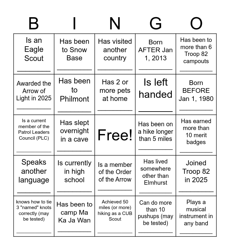 This bingo card has a free space and 24 words: Is currently in high school _________, Has been to camp Ma Ka Ja Wan _________, Has 2 or more pets at home _________, knows how to tie 3 "named" knots correctly (may be tested) _____________, Has been to more than 6 Troop 82 campouts __________, Is an Eagle Scout ________, Awarded the Arrow of Light in 2025 __________, Has been to Snow Base _________, Has been on a hike longer than 5 miles __________, Is a member of the Order of the Arrow __________, Is left handed ______, Is a current member of the Patrol Leaders Council (PLC) _____________, Has lived somewhere other than Elmhurst __________, Joined Troop 82 in 2025 _________, Has been to Philmont ________, Can do more than 10 pushups (may be tested) ___________, Has earned more than 10 merit badges __________, Has visited another country _________, Born BEFORE Jan 1, 1980 _________, Has slept overnight in a cave _________, Plays a musical instrument in any band __________, Speaks another language ________, Born AFTER Jan 1, 2013 _________ and Achieved 50 miles (or more) hiking as a CUB Scout _____________.