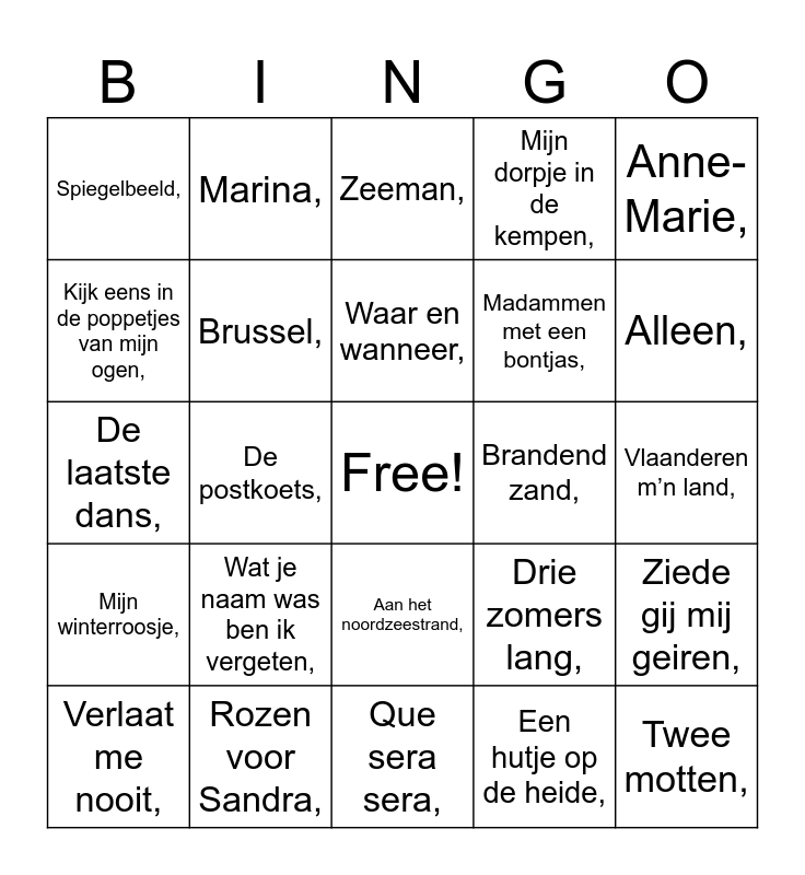 This bingo card has a free space and 42 words: Tulpen uit Amsterdam,, Waar en wanneer,, Morgen,, Wat je naam was ben ik vergeten,, Een hutje op de heide,, Ziede gij mij geiren,, Twee motten,, ’t Sleutelkind,, Zeeman,, Aan het noordzeestrand,, Vlaanderen m’n land,, Alleen,, De postkoets,, Anne-Marie,, Grootvaders klok,, Drie zomers lang,, Mijn dorpje in de kempen,, De laatste dans,, 'k heb de mot in mijn lijf,, Marina,, Kijk eens in de poppetjes van mijn ogen,, Aan de Amsterdamse grachten,, Een beetje,, Spiegelbeeld,, Blanche en zijn peird,, Dag vreemde man,, Madammen met een bontjas,, Zal je dan nog voor me zorgen,, Smurfenlied,, Eenzaam zonder jou,, Weet je nog die slow,, Mijn winterroosje,, Brussel,, Que sera sera,, Zomersproetjes,, Verlaat me nooit,, Rozen voor Sandra,, Brandend zand,, ‘k hem geblet,, Een roosje m’n roosje,, Mijn dorpje in de kempen, and De boerinnekesdans,.