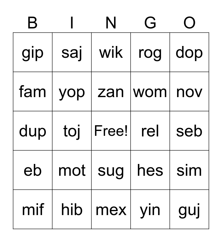 This bingo card has a free space and 24 words: mot, hib, zan, mif, dop, gip, fam, saj, rel, sug, wom, dup, hes, sim, yop, yin, seb, wik, nov, toj, guj, eb, rog and mex.