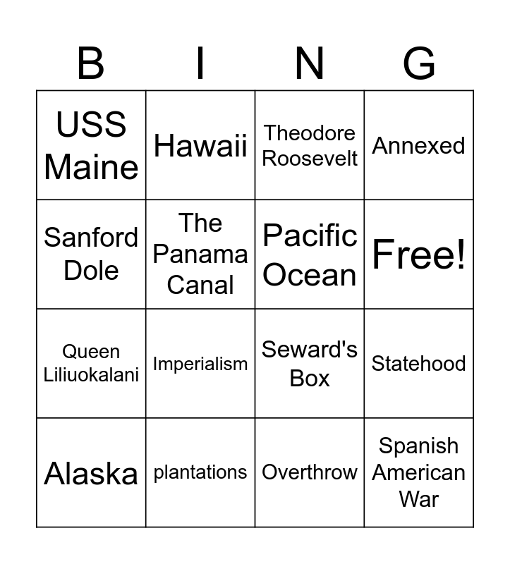 This bingo card has 18 words: Imperialism, Spanish American War, Theodore Roosevelt, USS Maine, Seward's Box, Annexed, Alaska, Hawaii, Free!, Queen Liliuokalani, Overthrow, Sanford Dole, Statehood, The Panama Canal, Pacific Ocean, Atlantic Ocean, plantations and William Seward.