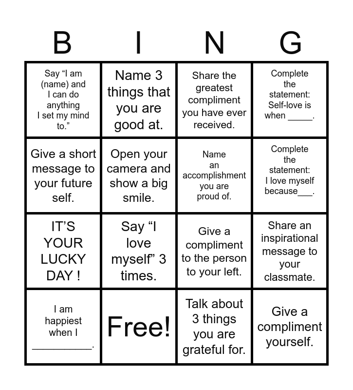 This bingo card has 25 words: Share a happy event in your life., Name 3 things that makes you happy., Complete the statement: I love myself because___., Give a heart sign on the zoom meeting., Give a short message to your future self., Say “I am (name) and I can do anything I set my mind to.”, Open your camera and show a big smile., Name 3 things that you are good at., Free!, Share your favorite song or genre of music., IT’S YOUR LUCKY DAY !, Give a compliment to the person to your left., Share your favorite book., Give a compliment the person to your right, Name an accomplishment you are proud of., Say something positive about yourself., Talk about 3 things you are grateful for., Share the greatest compliment you have ever received., Say “I love myself” 3 times., Share an inspirational message to your classmate., I am happiest when I ___________., GOT YA ! PICK ANOTHER TILE., Give a compliment yourself., Complete the statement: Self-love is when _____. and Give a compliment to someone in the virtual classroom..