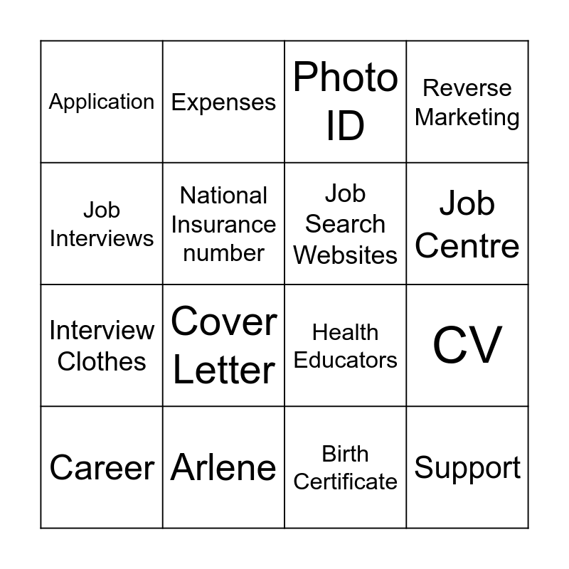 This bingo card has 16 words: Arlene, CV, Photo ID, Application, Interview Clothes, Expenses, Health Educators, Birth Certificate, Job Interviews, National Insurance number, Career, Reverse Marketing, Cover Letter, Job Centre, Job Search Websites and Support.