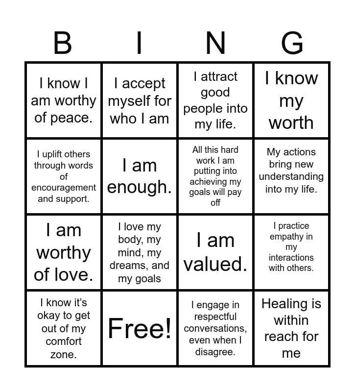This bingo card has 28 words: I grow and improve every day., I am courageous., I am worthy of love., Nothing can disrupt my peace., I am enough., I attract good people into my life., I accept myself for who I am, Healing is within reach for me, Free!, I commit to being a positive role model for civility., I am valued., I know my worth, I accept that I am not perfect., I advocate for accessibility and inclusivity., I love my body, my mind, my dreams, and my goals, I let go of stress., I can be relaxed in all situations., All this hard work I am putting into achieving my goals will pay off, My actions bring new understanding into my life., Negative thoughts do not serve me anymore, I know I am worthy of peace., The power is in my hands., I know it’s okay to get out of my comfort zone., I practice empathy in my interactions with others., I engage in respectful conversations, even when I disagree., I celebrate the diversity of thought in my academic pursuits., I uplift others through words of encouragement and support. and I am proud of myself and will continue to strive to do well.