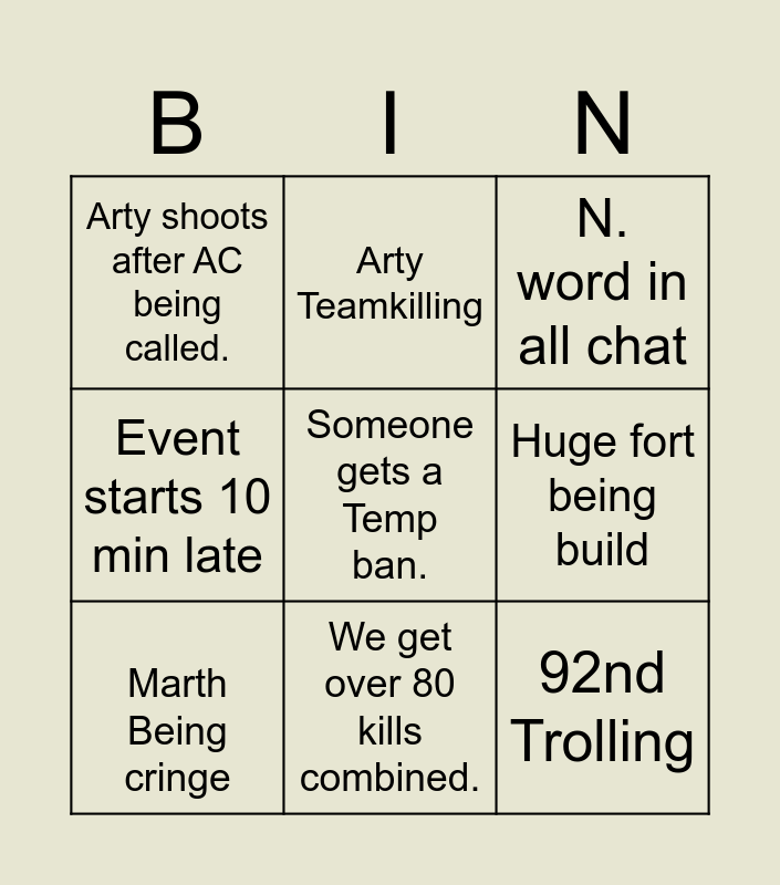 This bingo card has 9 words: Marth Being cringe, N. word in all chat, Arty Teamkilling, Event starts 10 min late, Arty shoots after AC being called., Huge fort being build, Someone gets a Temp ban., 92nd Trolling and We get over 80 kills combined..