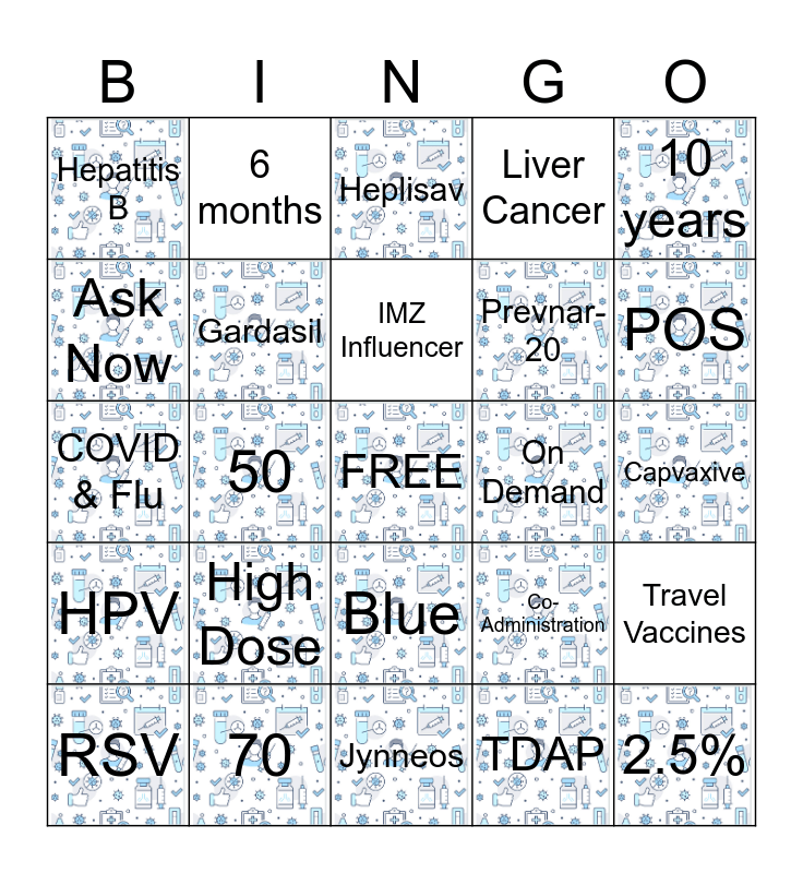 This bingo card has 24 images, a free space and 29 words: RSV, Arexvy, 50, 18+, Hepatitis B, Heplisav, Gardasil, High Dose, On Demand, 70, Capvaxive, 2.5%, Jynneos, TDAP, POS, 32-36 weeks, Blue, HPV, 10 years, COVID & Flu, Co-Administration, Abrysvo, Prevnar-20, Ask Now, Liver Cancer, 6 months, Travel Vaccines, IMZ Influencer and Protect our patients.