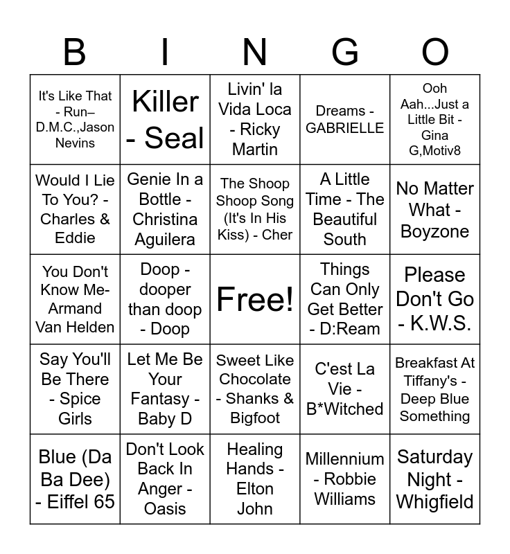 This bingo card has a free space and 59 words: Jesus to a Child - George Michael, Don't Look Back In Anger - Oasis, Pray - Take That, Say You'll Be There - Spice Girls, Millennium - Robbie Williams, ...Baby One More Time - Britney Spears, Genie In a Bottle - Christina Aguilera, Never Ever - All Saints, A Little Time - The Beautiful South, Love Is All Around - Wet Wet Wet, Dreams - GABRIELLE, I Wanna Be the Only One- Eternal,Bebe Winans, Would I Lie To You? - Charles & Eddie, (I Can't Help) Falling In Love- UB40, Ice Ice Baby - Vanilla Ice, It's Like That - Run–D.M.C.,Jason Nevins, Saturday Night - Whigfield, Ooh Aah...Just a Little Bit - Gina G,Motiv8, Young at Heart - The Bluebells, The Shoop Shoop Song (It's In His Kiss) - Cher, Things Can Only Get Better - D:Ream, Livin' la Vida Loca - Ricky Martin, Blue (Da Ba Dee) - Eiffel 65, Breakfast At Tiffany's - Deep Blue Something, King of My Castle - Wamdue Project, Because We Want To - Billie, I Want It That Way - Backstreet Boys, Any Dream Will Do - Andrew Lloyd Webber, No Matter What - Boyzone, Keep On Movin' - Five,Steve Mac, Professional Widow - Armand's Star Trunk Funkin' Mix, Believe - Cher, 9 PM - Till I come- ATB, Praise You - Radio Edit - Fatboy Slim, Killer - Seal, Deeper Underground - Jamiroquai, MMMBop - Hanson, Doop - dooper than doop - Doop, The Real Thing - Tony Di Bart, You Don't Know Me- Armand Van Helden, You're Not Alone - Olive, Let Me Be Your Fantasy -Baby D, Please Don't Go - K.W.S., Block Rockin' Beats - The Chemical Brothers, Dreamer - Livin' Joy, Tragedy - Steps, Your Woman - White Town, Dub Be Good To Me - Beats International, Sweet Like Chocolate - Shanks & Bigfoot, Healing Hands - Elton John, Boom Boom Boom - The Outhere Brothers, Flying Without Wings - Westlife, Heartbeat - Steps, Mambo No. 5 (a Little Bit of...) - Lou Bega, Doctor Jones - Aqua, C'est La Vie - B*Witched, Rollercoaster - B*Witched, Relight My Fire- Take That,Lulu and Bring It All Back - S Club.