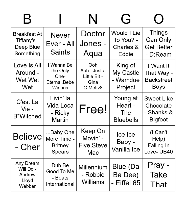 This bingo card has a free space and 46 words: Don't Look Back In Anger - Oasis, Pray - Take That, Say You'll Be There - Spice Girls, Millennium - Robbie Williams, ...Baby One More Time - Britney Spears, Genie In a Bottle - Christina Aguilera, Never Ever - All Saints, A Little Time - The Beautiful South, Love Is All Around - Wet Wet Wet, Dreams - GABRIELLE, I Wanna Be the Only One- Eternal,Bebe Winans, Would I Lie To You? - Charles & Eddie, (I Can't Help) Falling In Love- UB40, Ice Ice Baby - Vanilla Ice, It's Like That - Run–D.M.C.,Jason Nevins, Saturday Night - Whigfield, Ooh Aah...Just a Little Bit - Gina G,Motiv8, Young at Heart - The Bluebells, The Shoop Shoop Song (It's In His Kiss) - Cher, Things Can Only Get Better - D:Ream, Livin' la Vida Loca - Ricky Martin, Blue (Da Ba Dee) - Eiffel 65, Breakfast At Tiffany's - Deep Blue Something, King of My Castle - Wamdue Project, Because We Want To - Billie, I Want It That Way - Backstreet Boys, Any Dream Will Do - Andrew Lloyd Webber, No Matter What - Boyzone, Keep On Movin' - Five,Steve Mac, Believe - Cher, Praise You - Radio Edit - Fatboy Slim, MMMBop - Hanson, Let Me Be Your Fantasy -Baby D, Tragedy - Steps, Your Woman - White Town, Dub Be Good To Me - Beats International, Sweet Like Chocolate - Shanks & Bigfoot, Boom Boom Boom - The Outhere Brothers, Flying Without Wings - Westlife, Heartbeat - Steps, Mambo No. 5 (a Little Bit of...) - Lou Bega, Doctor Jones - Aqua, C'est La Vie - B*Witched, Rollercoaster - B*Witched, Relight My Fire- Take That,Lulu and Bring It All Back - S Club.