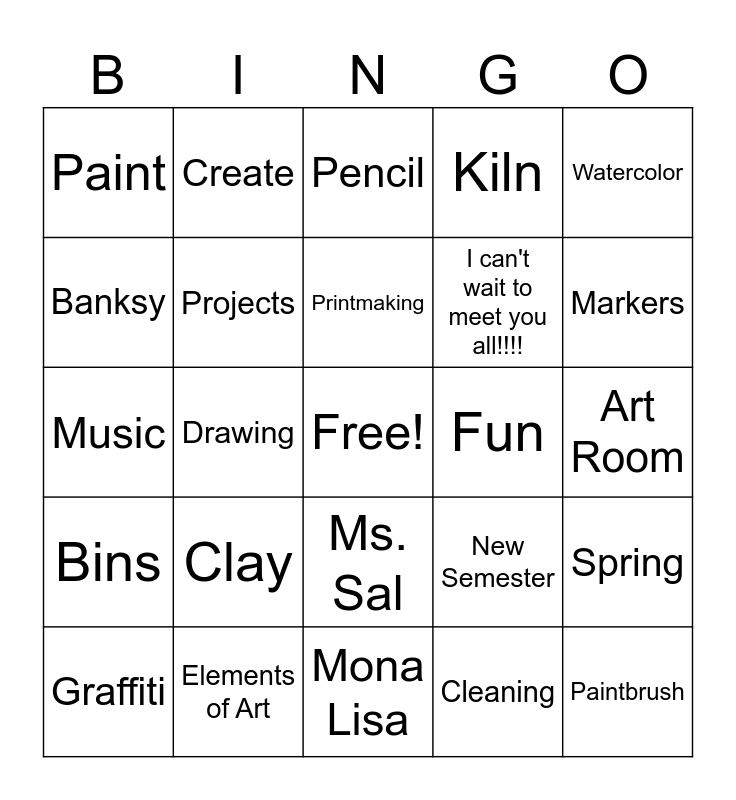 This bingo card has a free space and 24 words: Clay, Elements of Art, Printmaking, Graffiti, Watercolor, Paint, Banksy, Create, Fun, Ms. Sal, I can't wait to meet you all!!!!, Music, New Semester, Spring, Projects, Cleaning, Art Room, Pencil, Markers, Drawing, Paintbrush, Bins, Kiln and Mona Lisa.