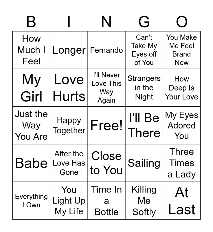 This bingo card has a free space and 34 words: Mandy, Killing Me Softly, Sara Smile, If You Leave Me Now, Babe, Love Hurts, You Make Me Feel Brand New, Everything I Own, Longer, You Are Everything, I'll Never Love This Way Again, Fernando, When I Need You, I Go Crazy, I'll Be There, How Deep Is Your Love, You Light Up My Life, Just the Way You Are, After the Love Has Gone, Sailing, Close to You, Your Song, How Much I Feel, My Eyes Adored You, Time In a Bottle, At Last, Can’t Take My Eyes off of You, Be My Baby, Strangers in the Night, My Girl, I Got You Babe, Happy Together, Three Times a Lady and You Decorated My Life.