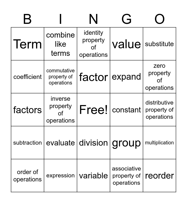 This bingo card has a free space and 24 words: evaluate, expression, factor, order of operations, substitute, Term, coefficient, combine like terms, constant, division, expand, factors, group, multiplication, commutative property of operations, associative property of operations, distributive property of operations, identity property of operations, zero property of operations, inverse property of operations, reorder, subtraction, value and variable.