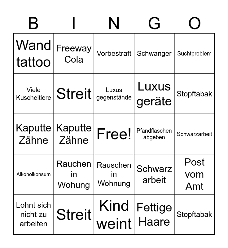This bingo card has a free space and 48 words: Fliesen- Tisch, Stopftabak, Lohnt sich nicht zu arbeiten, Kind weint, Rauchen in Wohung, Alkohol, Freeway Cola, Instant Kaffee, Viele Kuscheltiere, Verdreckte Wohnung, Streit, Schwanger, Post vom Amt, Schwarz arbeit, Geld leihen, Schulden, Luxus gegenstände, Pfandflaschen abgeben, Vorbestraft, Suchtproblem, Kaputte Zähne, Fettige Haare, Wand tattoo, Luxus geräte, Fliesentisch, Stopftabak, Lohnt sich nicht zu arbeiten, Kind weint, Rauschen in Wohnung, Alkoholkonsum, Freewaycola, Instantkaffee, Viele Kuscheltiere, Verdreckte Wohnung, Streit, Schwanger, Post vom Amt, Schwarzarbeit, Geld leihen, Schulden, Luxusgegenstände, Pfandflaschen, Vorbestraft, Suchtproblem, Kaputte Zähne, Fettige Haare, Wandtattoo and Luxusgeräte.