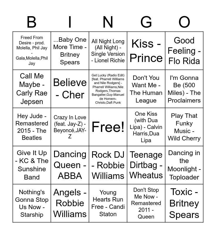 This bingo card has a free space and 53 words: I Wanna Dance with Somebody (Who Loves Me) - Whitney Houston, Toxic - Britney Spears, December, 1963 (Oh, What a Night) - Frankie Valli & The Four Seasons, Don't Stop Me Now - Remastered 2011 - Queen, Dancing Queen - ABBA, Valerie (feat. Amy Winehouse) - Version Revisited - Mark Ronson,Amy Winehouse, ...Baby One More Time - Britney Spears, Feel So Close - Radio Edit - Calvin Harris, Call Me Maybe - Carly Rae Jepsen, Under Pressure - Remastered 2011 - Queen,David Bowie, Believe - Cher, Wannabe - Spice Girls, Dancing in the Moonlight - Toploader, Teenage Dirtbag - Wheatus, You're The One That I Want - From “Grease” - John Travolta,Olivia Newton-John, Nothing's Gonna Stop Us Now - Starship, Get Lucky (Radio Edit) [feat. Pharrell Williams and Nile Rodgers] - Pharrell Williams,Nile Rodgers,Thomas Bangalter,Guy-Manuel de Homem-Christo,Daft Punk, One Kiss (with Dua Lipa) - Calvin Harris,Dua Lipa, All Star - Smash Mouth, Good Feeling - Flo Rida, Crazy In Love (feat. Jay-Z) - Beyoncé,JAY-Z, Walking On Sunshine - Katrina & The Waves, Don't You Want Me - The Human League, Freed From Desire - prod. Molella, Phil Jay - Gala,Molella,Phil Jay, Sweet Caroline - Neil Diamond, Angels - Robbie Williams, I'm a Believer - 2006 Remaster - The Monkees, You Can Call Me Al - Paul Simon, Don't Stop 'Til You Get Enough - Michael Jackson, I'm Gonna Be (500 Miles) - The Proclaimers, Just Can't Get Enough - Depeche Mode, California Gurls - Katy Perry,Snoop Dogg, Daddy Cool - Boney M., This Will Be (An Everlasting Love) - Natalie Cole, You Can't Hurry Love - The Supremes, U Can't Touch This - MC Hammer, Kiss - Prince, Young Hearts Run Free - Candi Staton, All Night Long (All Night) - Single Version - Lionel Richie, Wonderwall - Oasis, You Sexy Thing - Hot Chocolate, Never Too Much - Luther Vandross, Play That Funky Music - Wild Cherry, Gettin' Jiggy Wit It - Will Smith, I Believe in a Thing Called Love - The Darkness, Rock DJ - Robbie Williams, Footloose - From Footloose Soundtrack - Kenny Loggins, You to Me Are Everything - The Real Thing, Hey Jude - Remastered 2015 - The Beatles, Give It Up - KC & The Sunshine Band, Single Ladies (Put a Ring on It) - Beyoncé, We Are Family - 1995 Remaster - Sister Sledge and Don't Look Back In Anger - Oasis.
