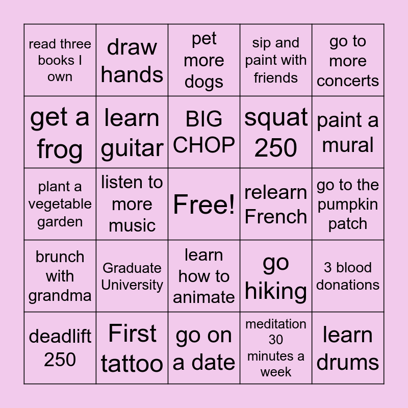 This bingo card has a free space and 24 words: Graduate University, First tattoo, BIG CHOP, deadlift 250, go to more concerts, read three books I own, get a frog, draw hands, relearn French, learn how to animate, squat 250, plant a vegetable garden, go hiking, 3 blood donations, learn guitar, meditation 30 minutes a week, go to the pumpkin patch, pet more dogs, paint a mural, listen to more music, learn drums, brunch with grandma, sip and paint with friends and go on a date.