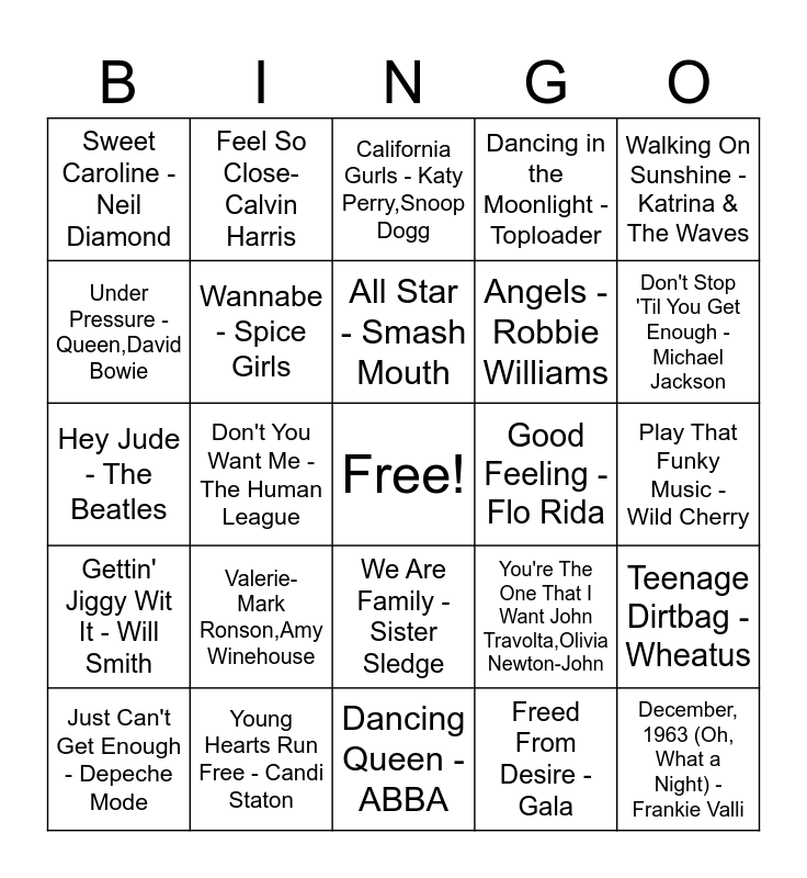 This bingo card has a free space and 51 words: Toxic - Britney Spears, December, 1963 (Oh, What a Night) - Frankie Valli, Don't Stop Me Now - Remastered 2011 - Queen, Dancing Queen - ABBA, Valerie- Mark Ronson,Amy Winehouse, ...Baby One More Time - Britney Spears, Feel So Close- Calvin Harris, Call Me Maybe - Carly Rae Jepsen, Under Pressure - Queen,David Bowie, Believe - Cher, Wannabe - Spice Girls, Dancing in the Moonlight - Toploader, Teenage Dirtbag - Wheatus, You're The One That I Want John Travolta,Olivia Newton-John, Nothing's Gonna Stop Us Now - Starship, One Kiss (with Dua Lipa) - Calvin Harris,Dua Lipa, All Star - Smash Mouth, Good Feeling - Flo Rida, Crazy In Love (feat. Jay-Z) - Beyoncé,JAY-Z, Walking On Sunshine - Katrina & The Waves, Don't You Want Me - The Human League, Freed From Desire - Gala, Sweet Caroline - Neil Diamond, Angels - Robbie Williams, I'm a Believer The Monkees, You Can Call Me Al - Paul Simon, Don't Stop 'Til You Get Enough - Michael Jackson, I'm Gonna Be (500 Miles) - The Proclaimers, Just Can't Get Enough - Depeche Mode, California Gurls - Katy Perry,Snoop Dogg, Daddy Cool - Boney M., This Will Be (An Everlasting Love) - Natalie Cole, You Can't Hurry Love - The Supremes, U Can't Touch This - MC Hammer, Kiss - Prince, Young Hearts Run Free - Candi Staton, All Night Long (All Night)- Lionel Richie, Wonderwall - Oasis, You Sexy Thing - Hot Chocolate, Never Too Much - Luther Vandross, Play That Funky Music - Wild Cherry, Gettin' Jiggy Wit It - Will Smith, I Believe in a Thing Called Love - The Darkness, Rock DJ - Robbie Williams, Footloose - Kenny Loggins, You to Me Are Everything - The Real Thing, Hey Jude - The Beatles, Give It Up - KC & The Sunshine Band, Single Ladies (Put a Ring on It) - Beyoncé, We Are Family - Sister Sledge and Don't Look Back In Anger - Oasis.
