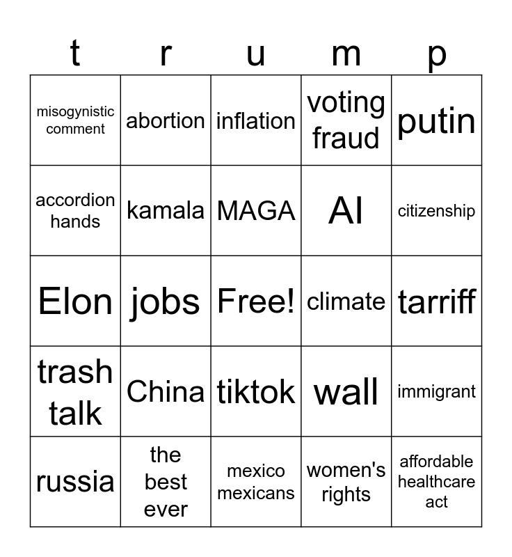 This bingo card has a free space and 24 words: China, the best ever, MAGA, russia, putin, misogynistic comment, accordion hands, abortion, climate, tiktok, AI, Elon, wall, immigrant, kamala, women's rights, tarriff, inflation, citizenship, jobs, affordable healthcare act, trash talk, voting fraud and mexico mexicans.