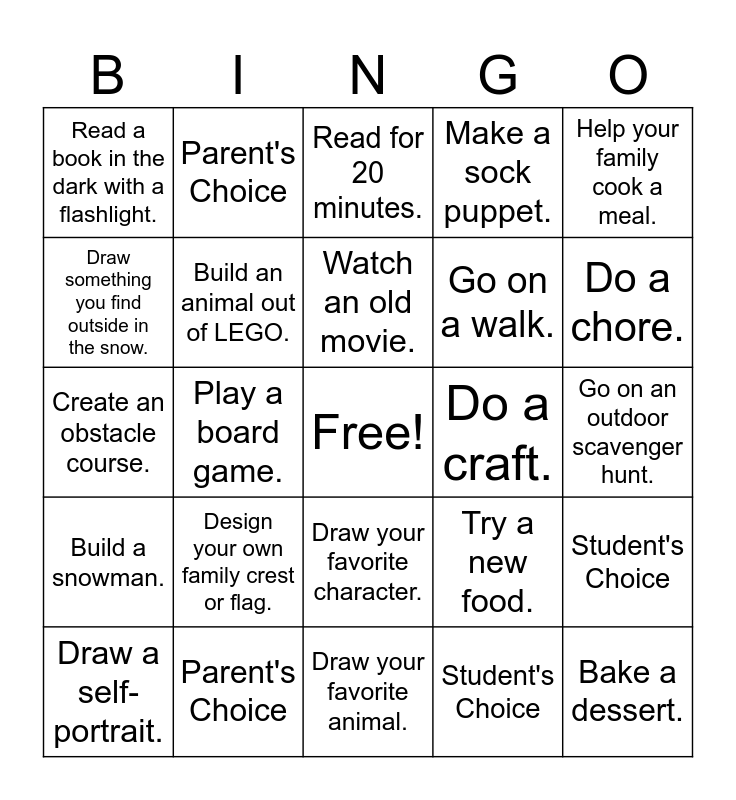 This bingo card has a free space and 24 words: Design your own family crest or flag., Parent's Choice, Watch an old movie., Draw a self-portrait., Help your family cook a meal., Read a book in the dark with a flashlight., Draw something you find outside in the snow., Parent's Choice, Do a craft., Draw your favorite character., Go on a walk., Create an obstacle course., Try a new food., Student's Choice, Build an animal out of LEGO., Student's Choice, Go on an outdoor scavenger hunt., Read for 20 minutes., Do a chore., Play a board game., Bake a dessert., Build a snowman., Make a sock puppet. and Draw your favorite animal..