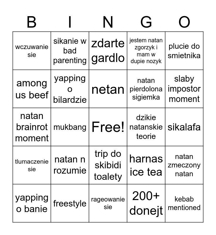This bingo card has a free space and 24 words: natan n rozumie, freestyle, netan, yapping o banie, plucie do smietnika, wczuwanie sie, among us beef, sikanie w bad parenting, dzikie natanskie teorie, trip do skibidi toalety, natan pierdolona sigiemka, natan brainrot moment, harnas ice tea, natan zmeczony natan, yapping o bilardzie, 200+ donejt, sikalafa, zdarte gardlo, slaby impostor moment, mukbang, kebab mentioned, tlumaczenie sie, jestem natan zgorzyk i mam w dupie nozyk and rageowanie sie.