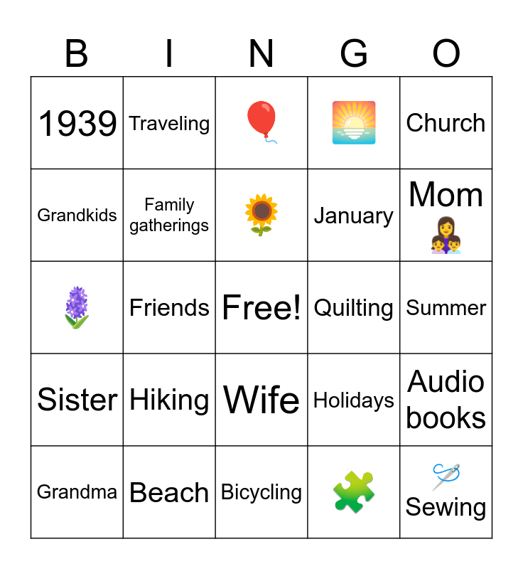 This bingo card has a free space and 48 words: Cross stitch, ๐ชก Sewing, Gardening ๐ฉ๐ปโ๐พ, Bicycling, Hiking, ๐๐ผโโ๏ธ, Traveling, ๐ฆ, Grandkids, Baking cookies, Family gatherings, ๐ , Audio books, Holidays, ๐, ๐, ๐ป, Quilting, Birdwatching, Church, Friends, ๐งฉ, 1939, January, 21st, Mom ๐ฉโ๐งโ๐ฆ, Grandma, Great Grandma, Wife, Sister, Christmas ๐ Markets, Germany, Florida, Water Aerobics, Beach, Camping, ๐, Summer, Water Skiing, ๐, Birthday Candles, ๐, ๐, ๐, ๐ชป, ๐ท, ๐น and ๐.
