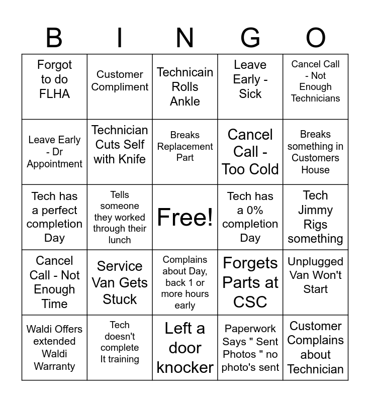 This bingo card has a free space and 24 words: Service Van Gets Stuck, Tech doesn't complete It training, Breaks Replacement Part, Waldi Offers extended Waldi Warranty, Cancel Call - Not Enough Technicians, Forgot to do FLHA, Leave Early - Dr Appointment, Customer Compliment, Tech has a 0% completion Day, Complains about Day, back 1 or more hours early, Cancel Call - Too Cold, Tech has a perfect completion Day, Forgets Parts at CSC, Unplugged Van Won't Start, Technician Cuts Self with Knife, Paperwork Says " Sent Photos " no photo's sent, Tech Jimmy Rigs something, Technicain Rolls Ankle, Breaks something in Customers House, Tells someone they worked through their lunch, Customer Complains about Technician, Cancel Call - Not Enough Time, Leave Early - Sick and Left a door knocker.